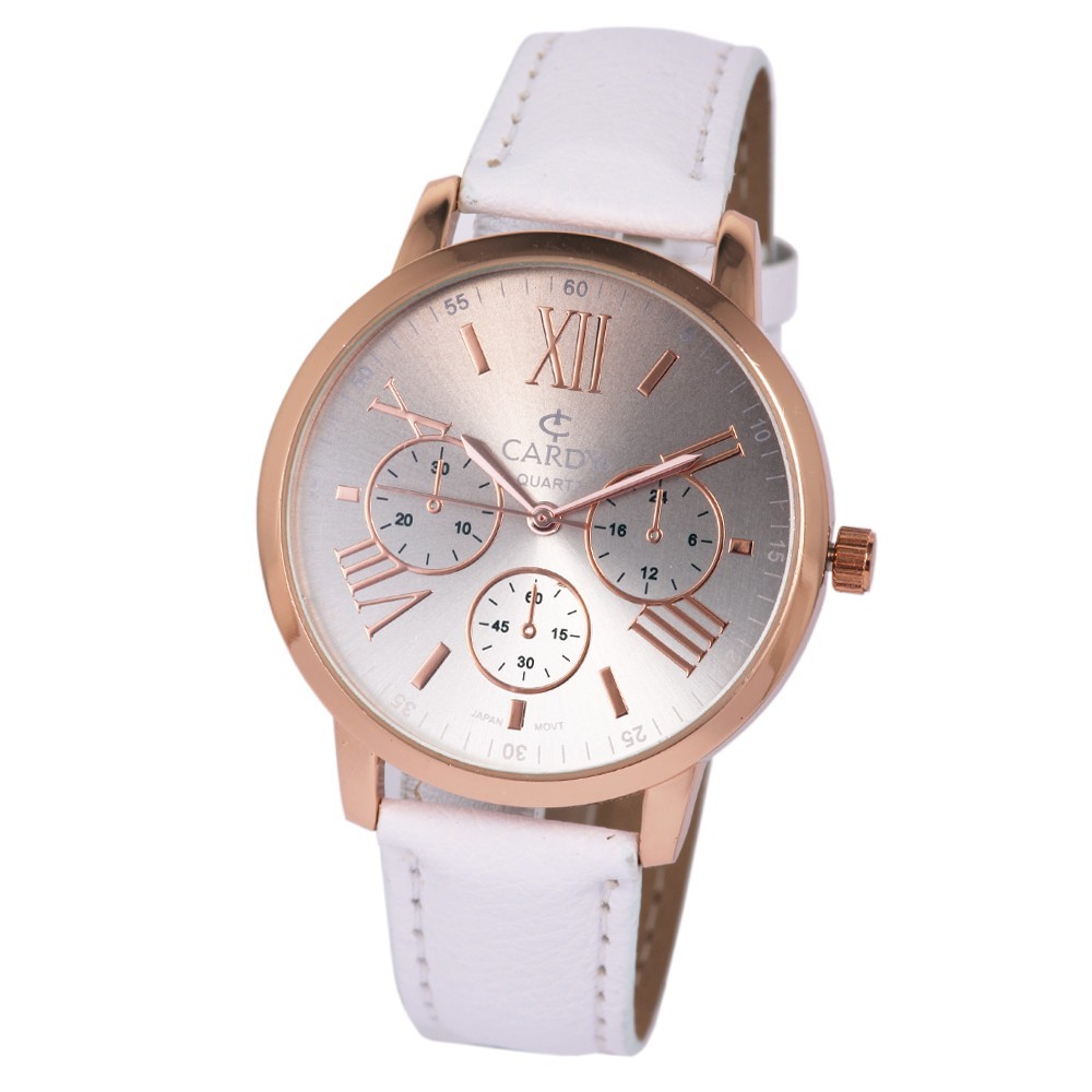 Cardy női karóra, rózsaarany színű fémtok, fehér szíj, ezüst színű számlap, quartz szerkezet, cseppmentes vízállóság