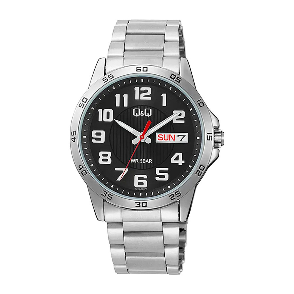 Q&Q férfi karóra, ezüst színű fémtok, ezüst színű nemesacél csat, fekete színű számlap, A37A-004PY