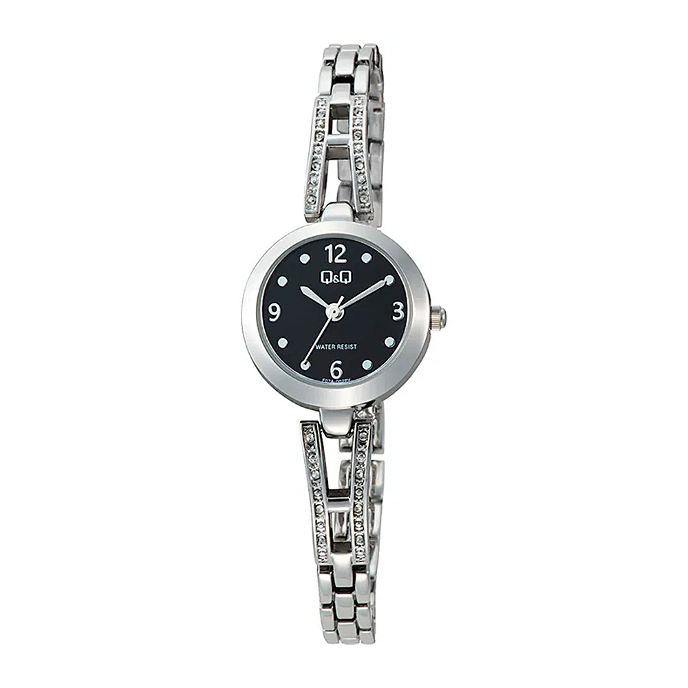 Q&Q női karóra, quartz, ezüst színű fémtok, ezüst színű nemesacél csat, fekete színű számlap, F07A-002PY