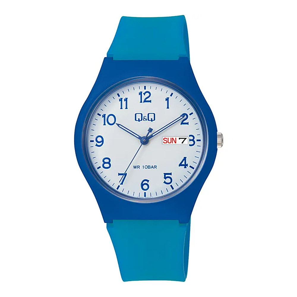 Q&Q férfi karóra, quartz, kék színű műanyag tok, kék színű műanyag szíj, fehér színű számlap, V39A-002VY