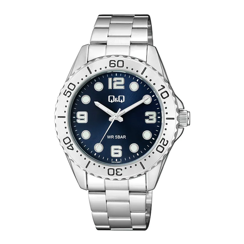 Q&Q férfi karóra, ezüst színű fémtok, kék színű foszforeszkálós számlap, ezüst színű fémcsat Q07A-005PY