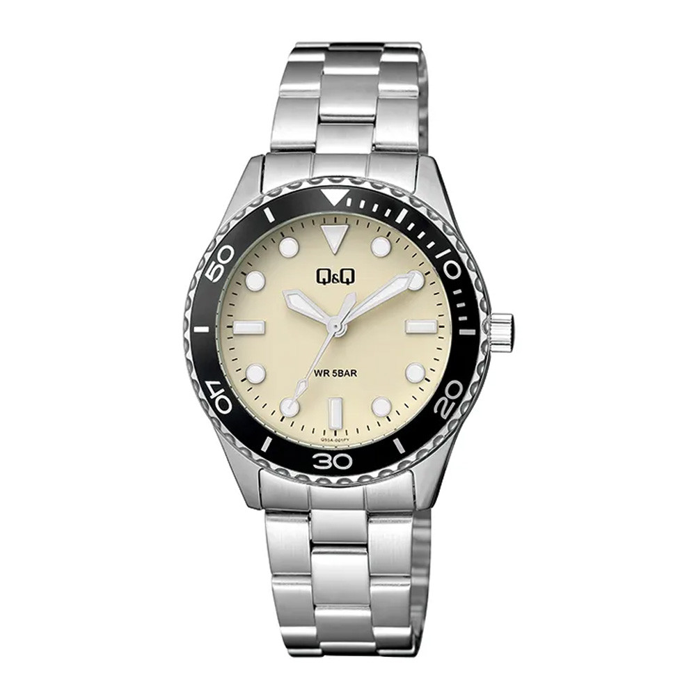 Q&Q női karóra, ezüst színű fémtok, bézs színű foszforeszkálós számlap, ezüst színű fémcsat Q55A-001PY