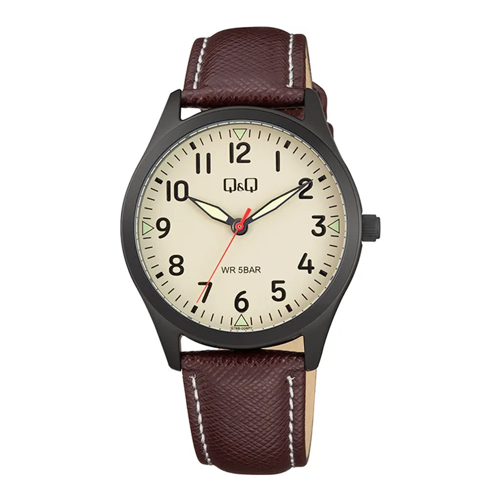 Q&Q nő karóra, fekete színű fémtok, szürke színű számlap, barna színű bőrszíj Q76B-004PY