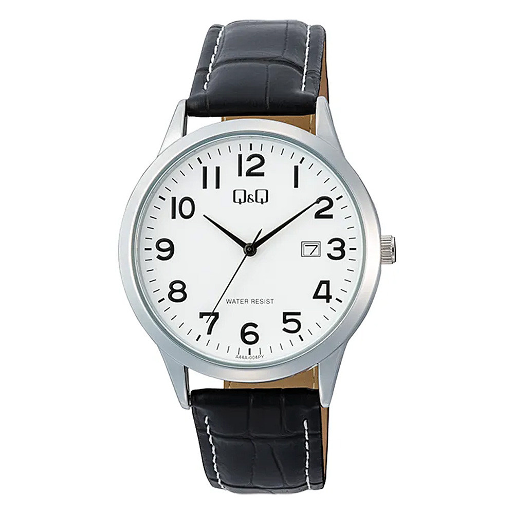 Q&Q férfi karóra, quartz, ezüst színű fémtok, fehér számlap, fekete színű bőrszíj A44A-004PY