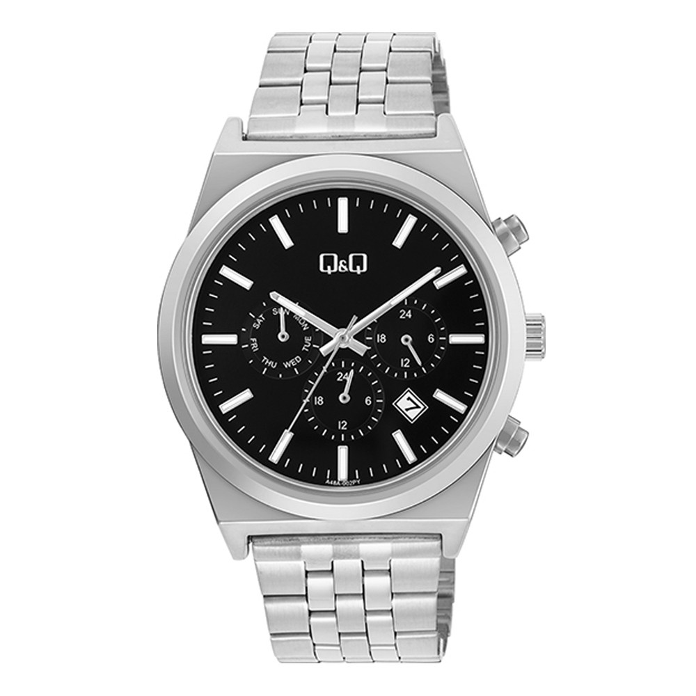 Q&Q férfi karóra, ezüst színű fémtok, ezüst színű fémcsat, fekete színű számlap, A48A-002PY
