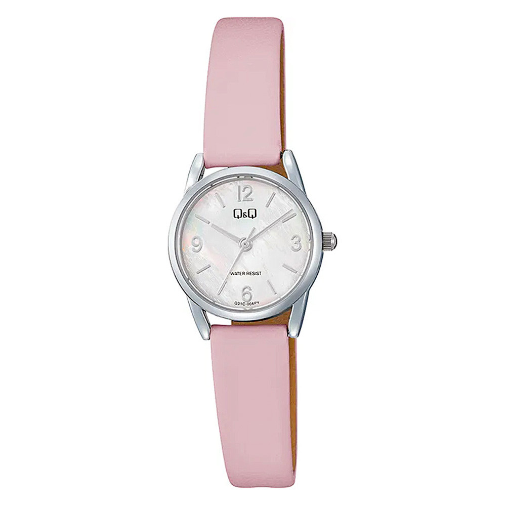 Q&Q női karóra, quartz, ezüst színű fémtok, rózsaszín színű bőrszíj, gyöngyház színű számlap, Q31C-004PY