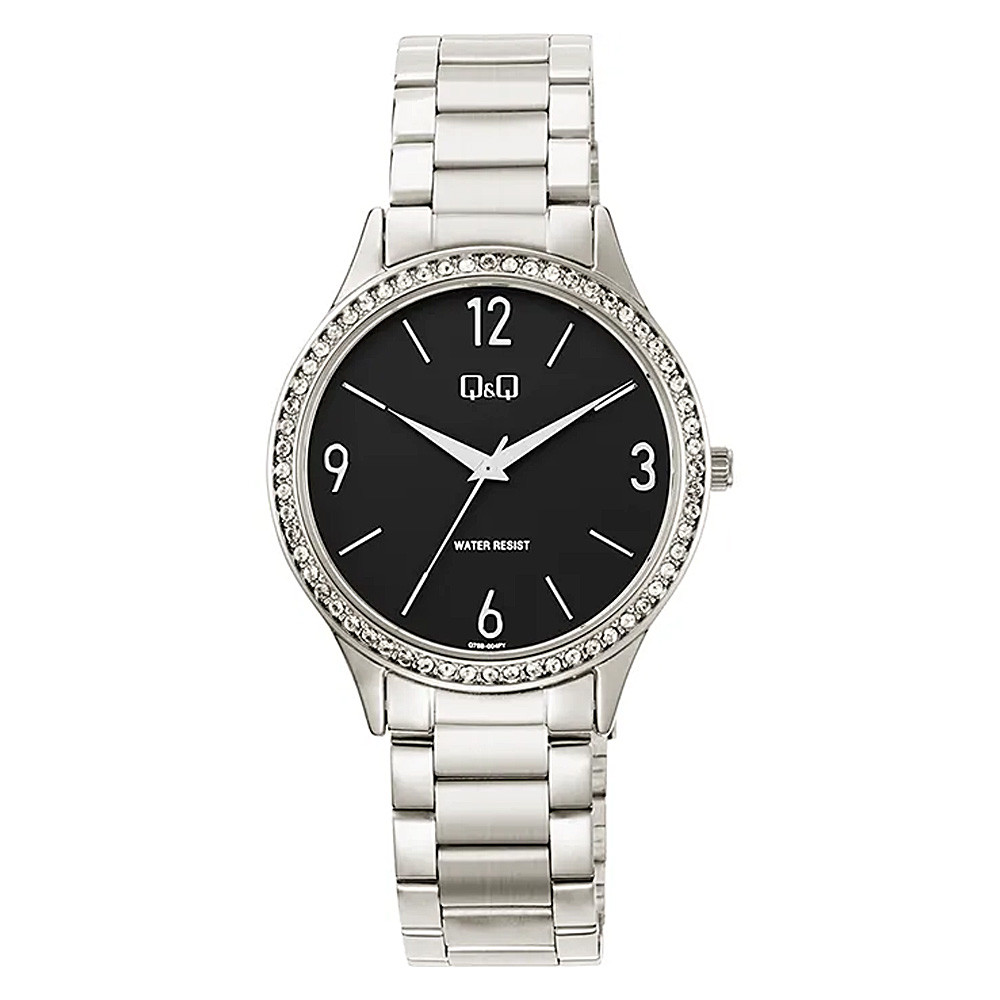 Q&Q női karóra, quartz, ezüst színű fémtok, ezüst színű fémcsat, fekete számlap, Q75B-004PY