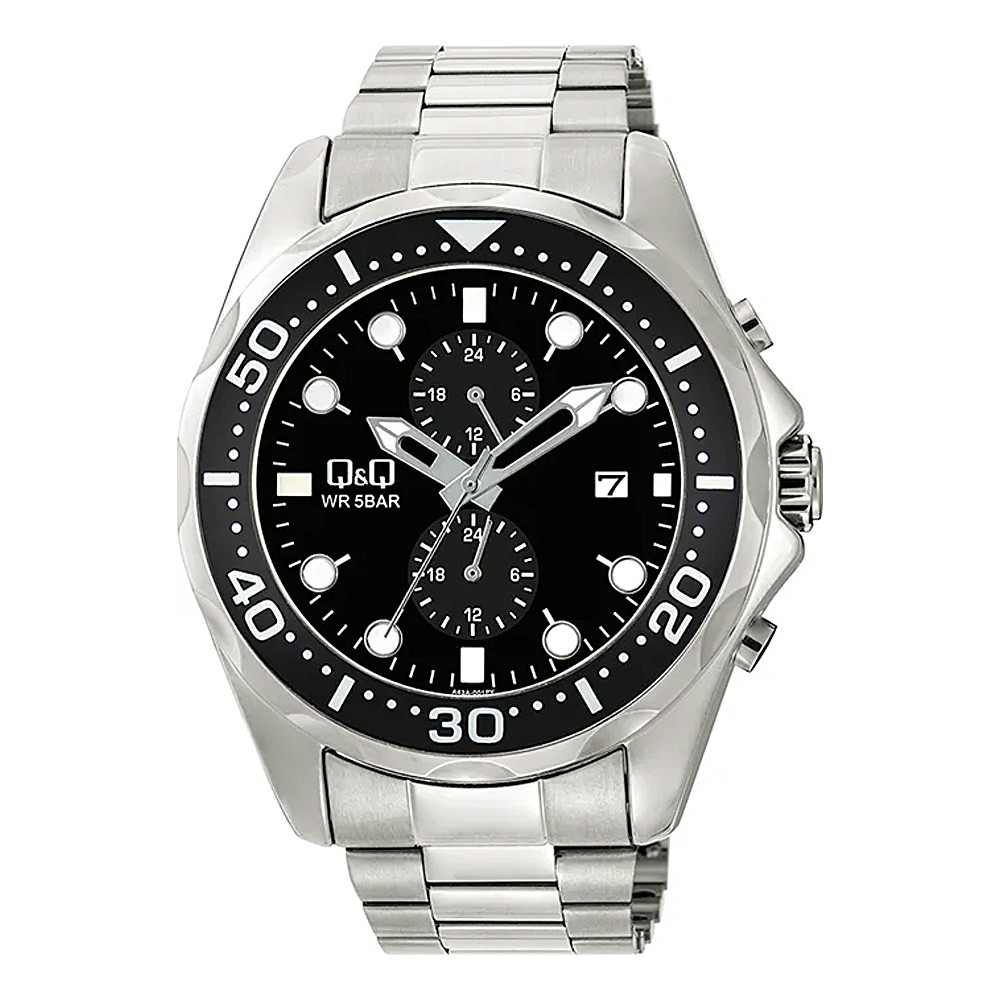 Q&Q férfi karóra, quartz, ezüst színű fémtok, ezüst színű fémcsat, fekete színű számlap, A43A-001PY