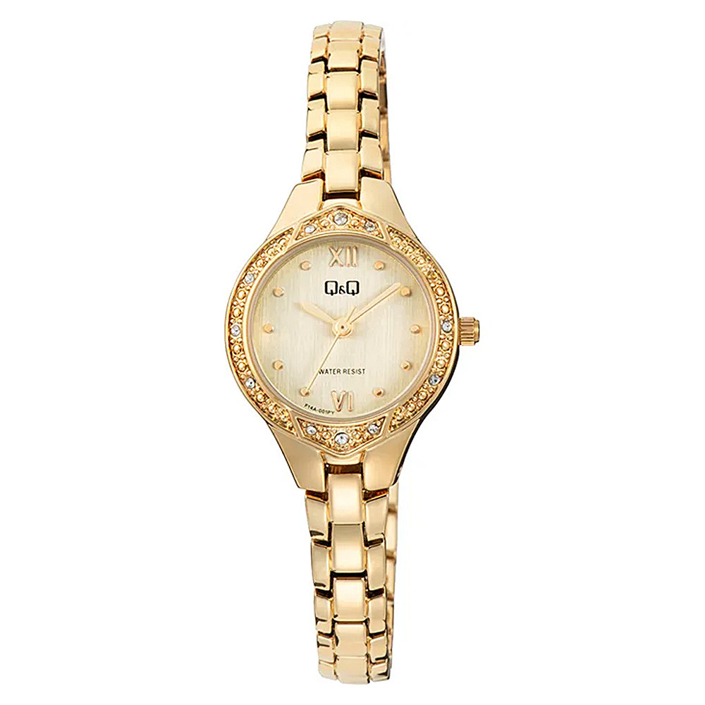 Q&Q női ékszeróra, quartz, arany színű fémtok, arany színű fémcsat, pezsgő színű számlap, F14A-001PY