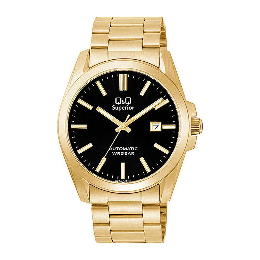 Q&Q férfi automata karóra, arany színű nemesacél tok, arany színű nemesacél szíj, fekete színű számlap (Superior) S23A-510PK