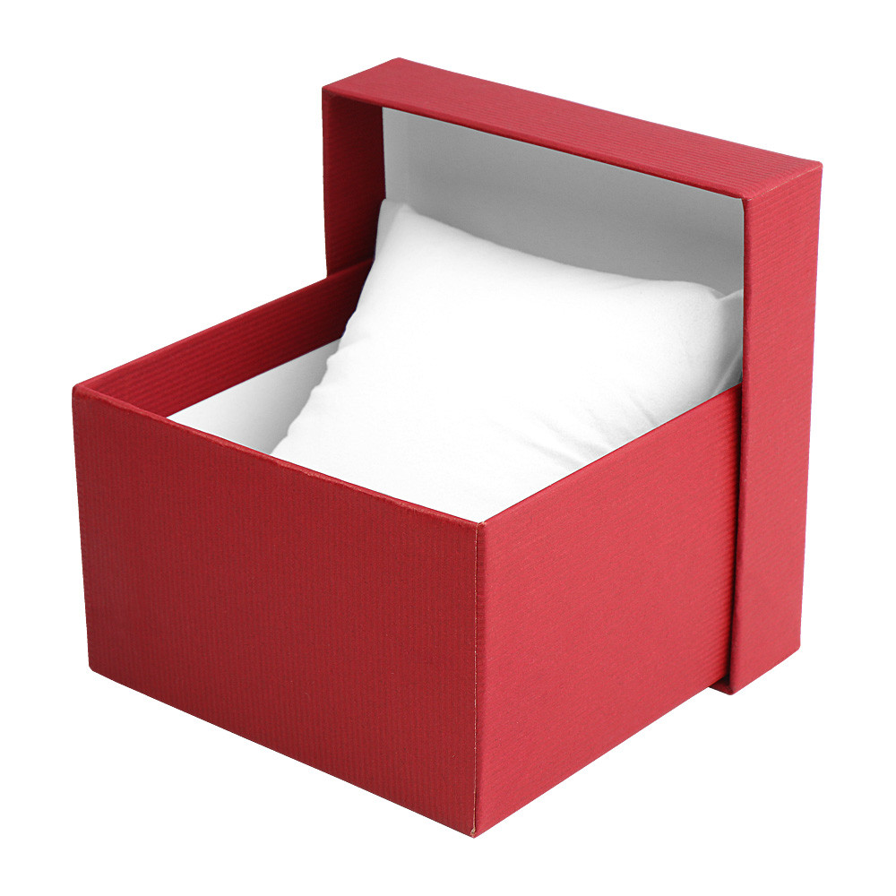 Logó nélküli karóra doboz, piros papír borítású külső, belül fehér párnával