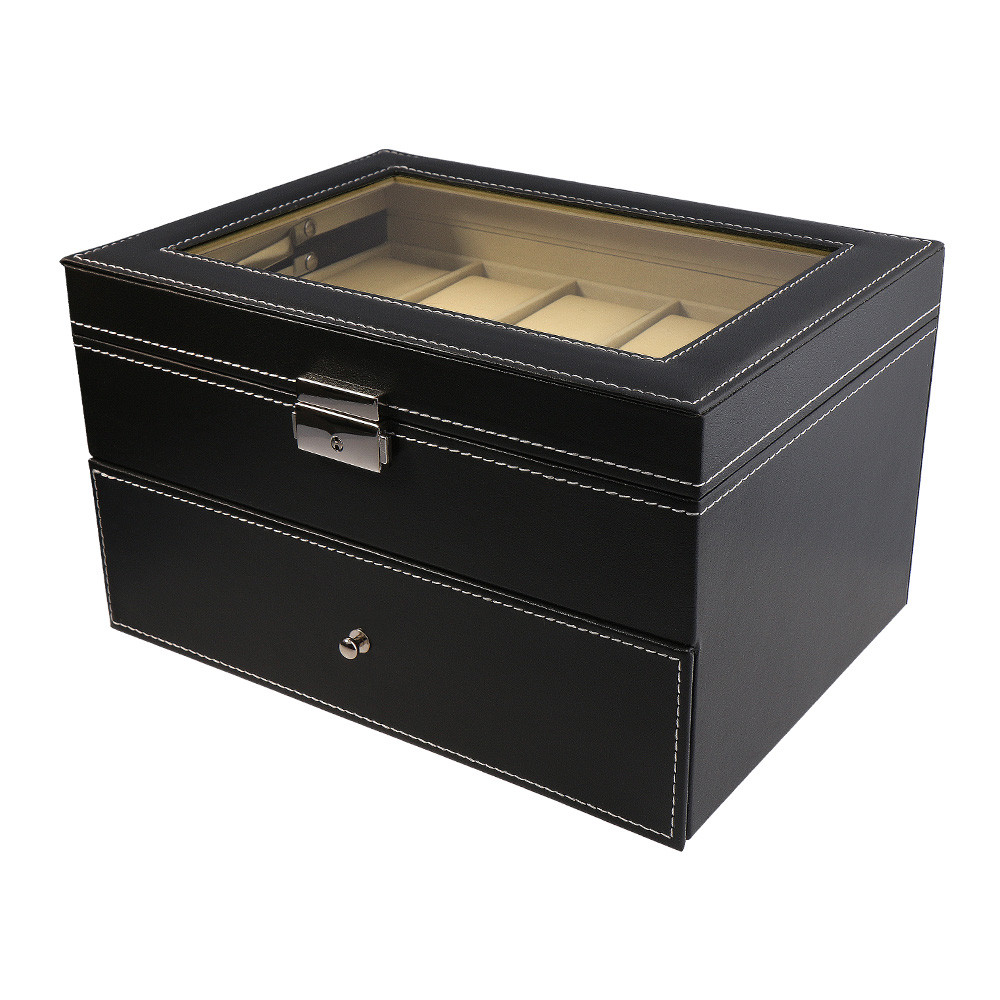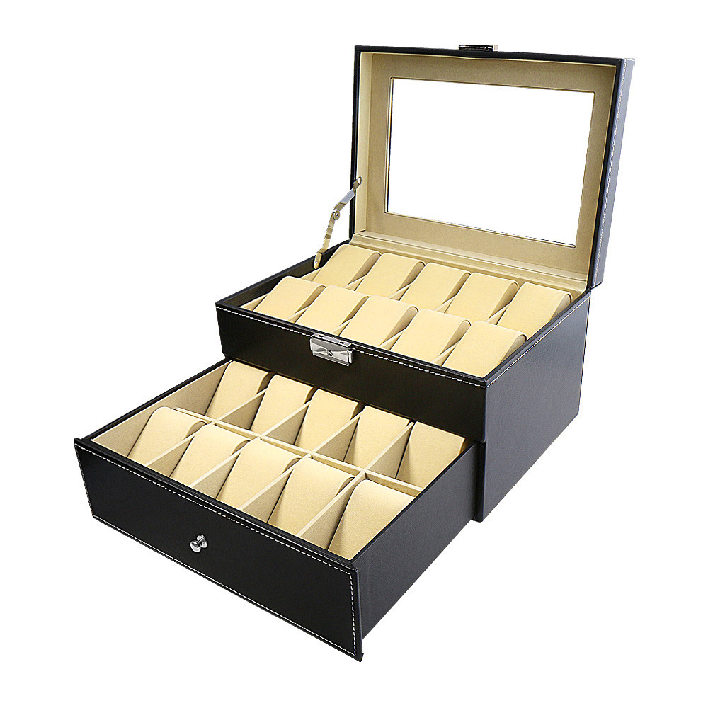 Óratartó doboz, 20 rekeszes, kívűl fekete műbőr borítás, belűl szürke textíl