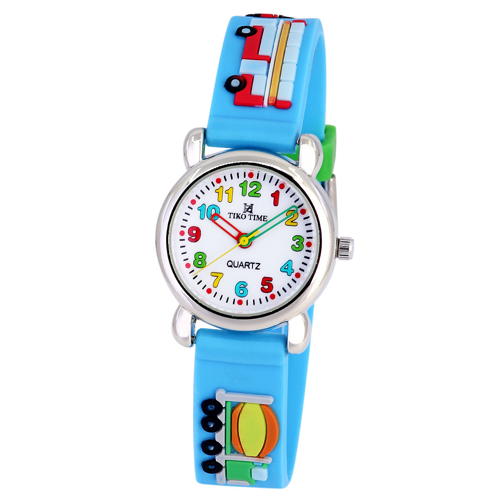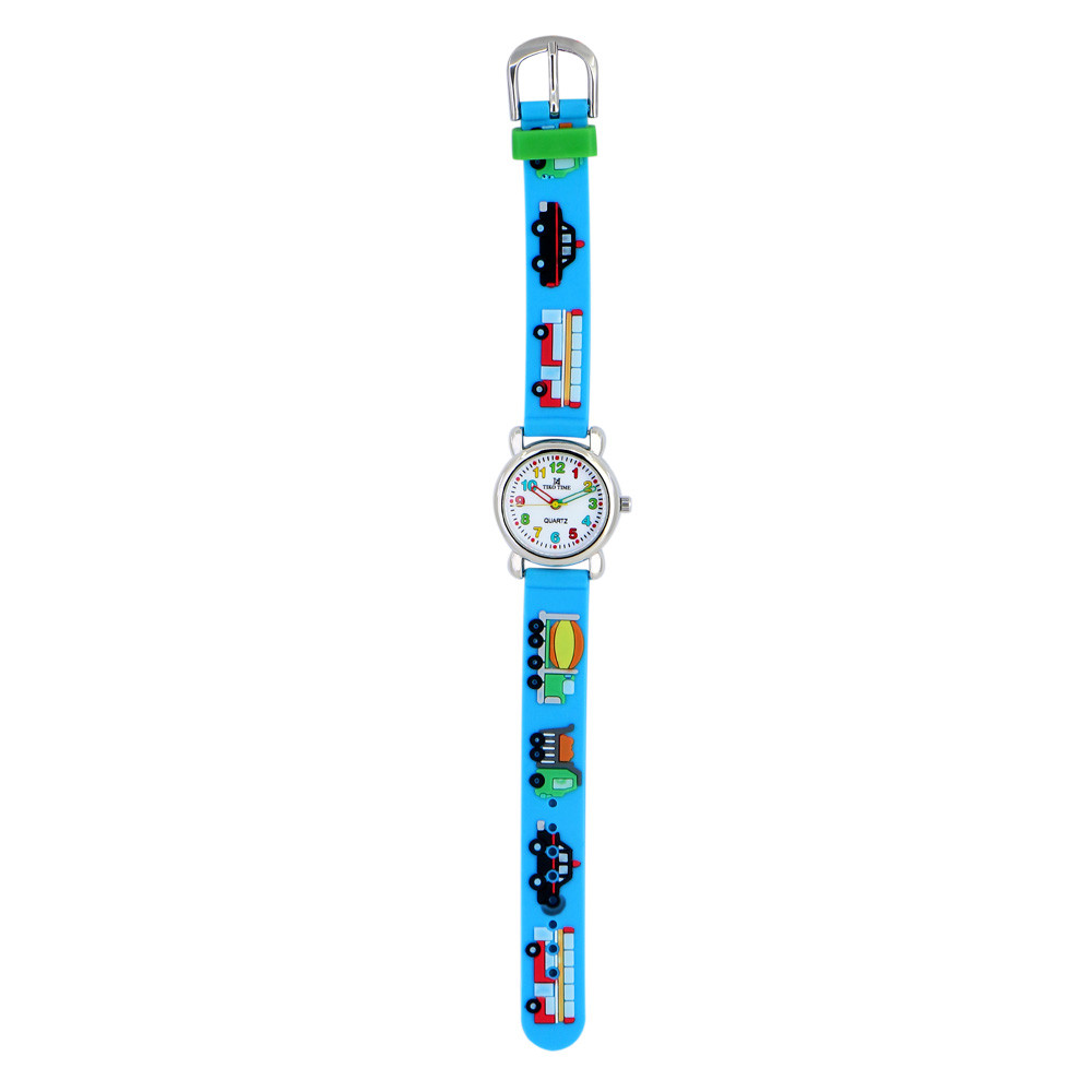 Tiko Time karóra gyerekeknek, ezüst színű fémtok, quartz szerkezet, 3D figurás szíj kék alapon (járművek), cseppmentes vízállóság
