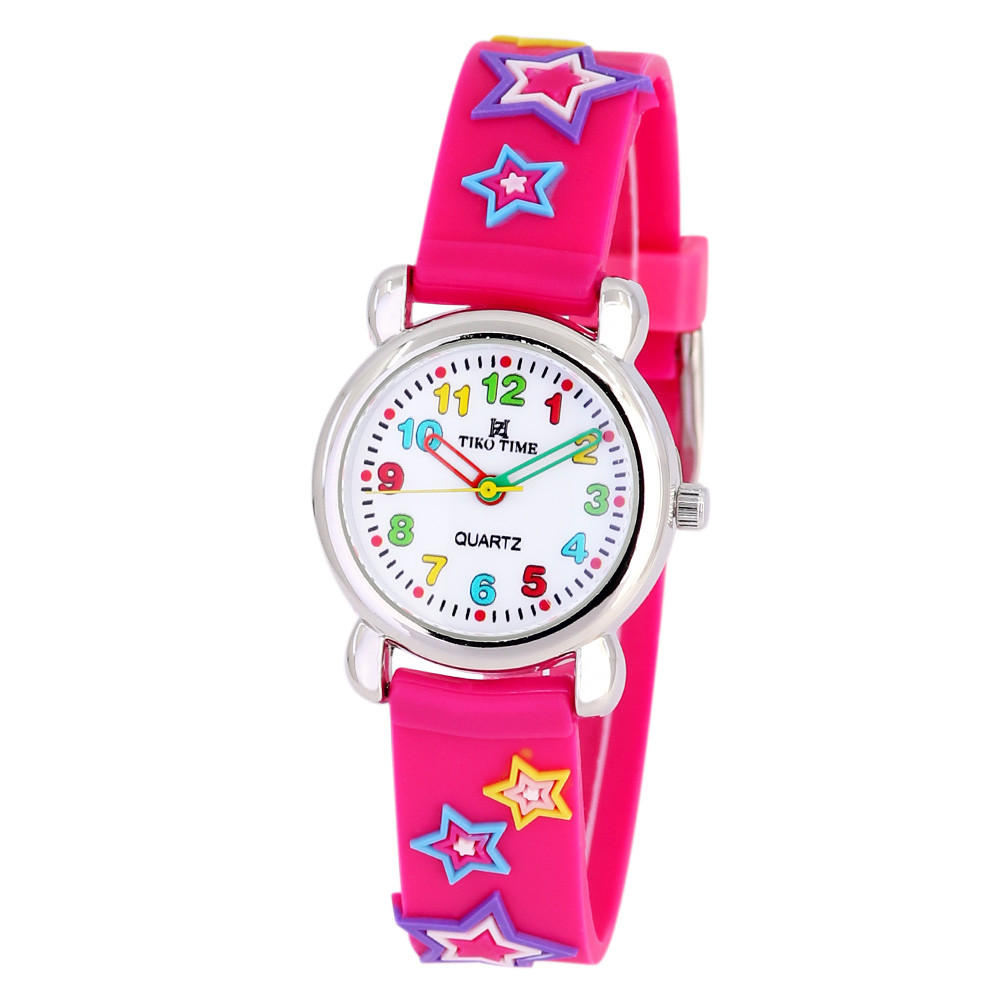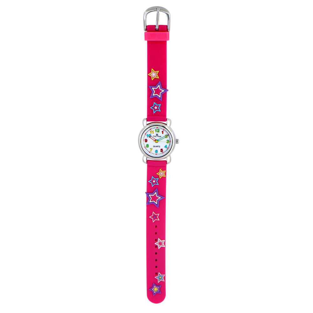 Tiko Time karóra gyerekeknek, ezüst színű fémtok, quartz szerkezet, 3D figurás szíj ciklámen alapon csillagok, cseppmentes vízállóság