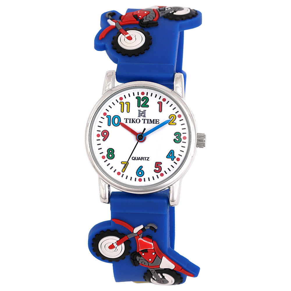 Tiko Time karóra gyerekeknek, ezüst színű fémtok, quartz szerkezet, fehér arab színű számlap, 3D figurás kék színű műanyag szíj, cseppmentes vízállóság (cross motoros)