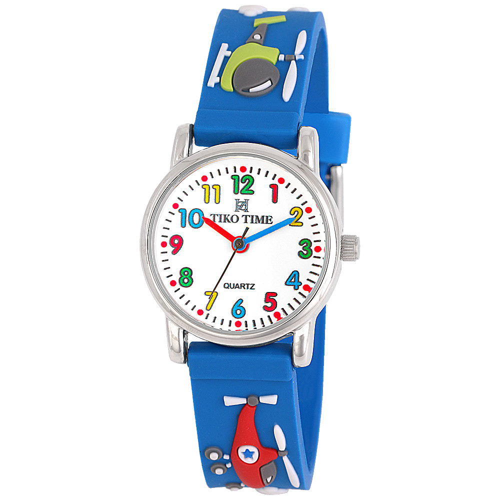 Tiko Time karóra gyerekeknek, ezüst színű fémtok, quartz szerkezet, fehér arab színű számlap, 3D figurás kék színű műanyag szíj, cseppmentes vízállóság (helikopteres)