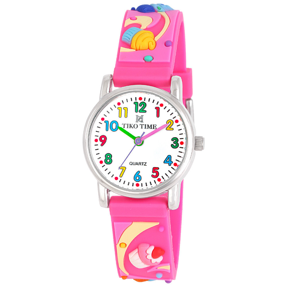 Tiko Time karóra gyerekeknek, ezüst színű fémtok, quartz szerkezet, fehér arab színű számlap, 3D figurás rózsaszín műanyag szíj, cseppmentes vízállóság (sütis)