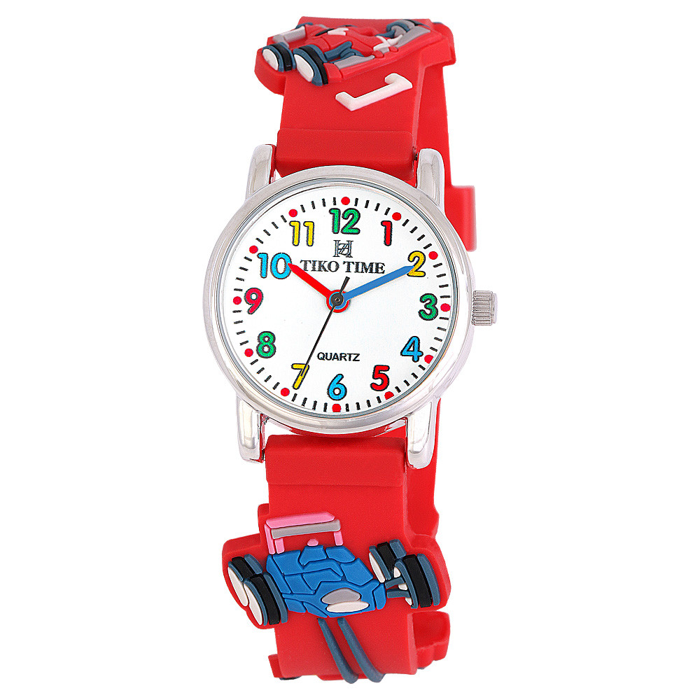 Tiko Time karóra gyerekeknek, ezüst színű fémtok, quartz szerkezet, fehér arab színű számlap, 3D figurás piros színű műanyag szíj, cseppmentes vízállóság (versenyautós)