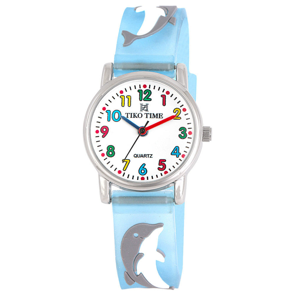 Tiko Time karóra gyerekeknek, ezüst színű fémtok, quartz szerkezet, fehér arab színű számlap, 3D figurás kékes áttetsző műanyag szíj, cseppmentes vízállóság (delfines)