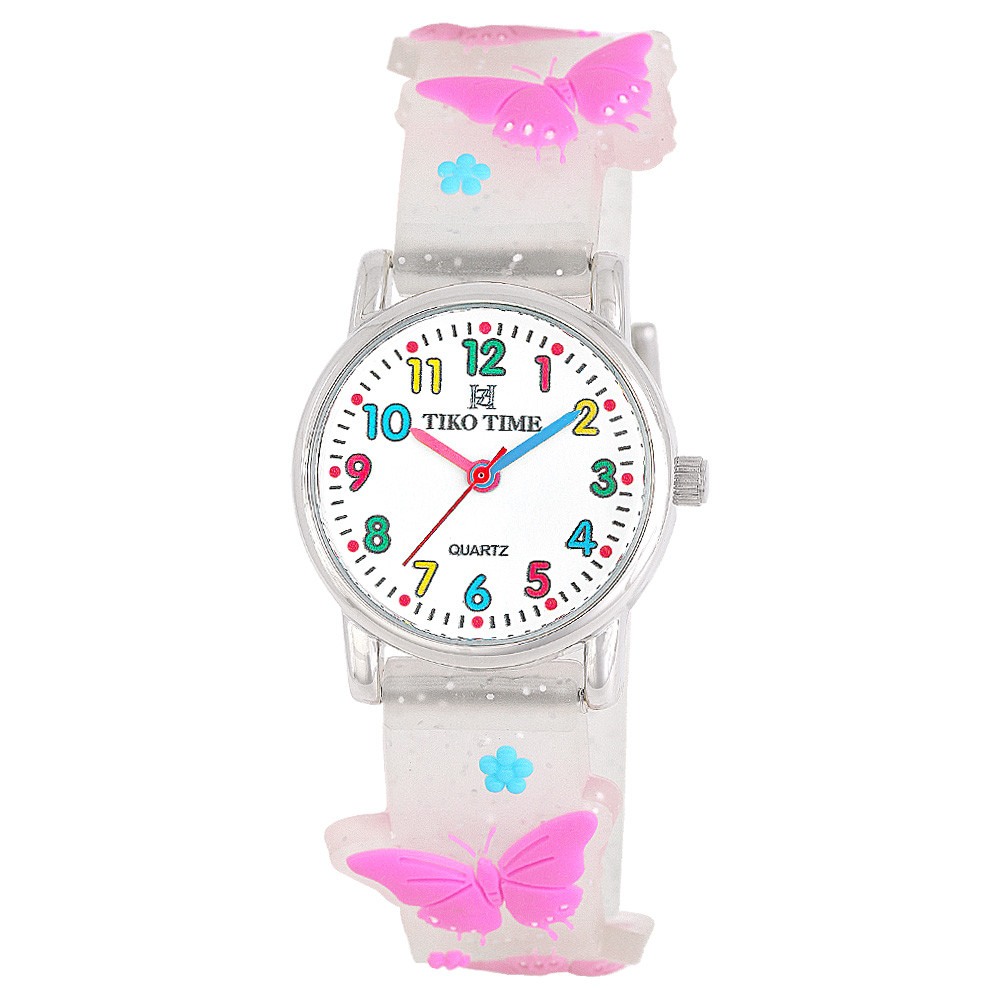 Tiko Time karóra gyerekeknek, ezüst színű fémtok, quartz szerkezet, fehér arab színű számlap, 3D figurás áttetsző csillámos műanyag szíj, cseppmentes vízállóság (lepkés)