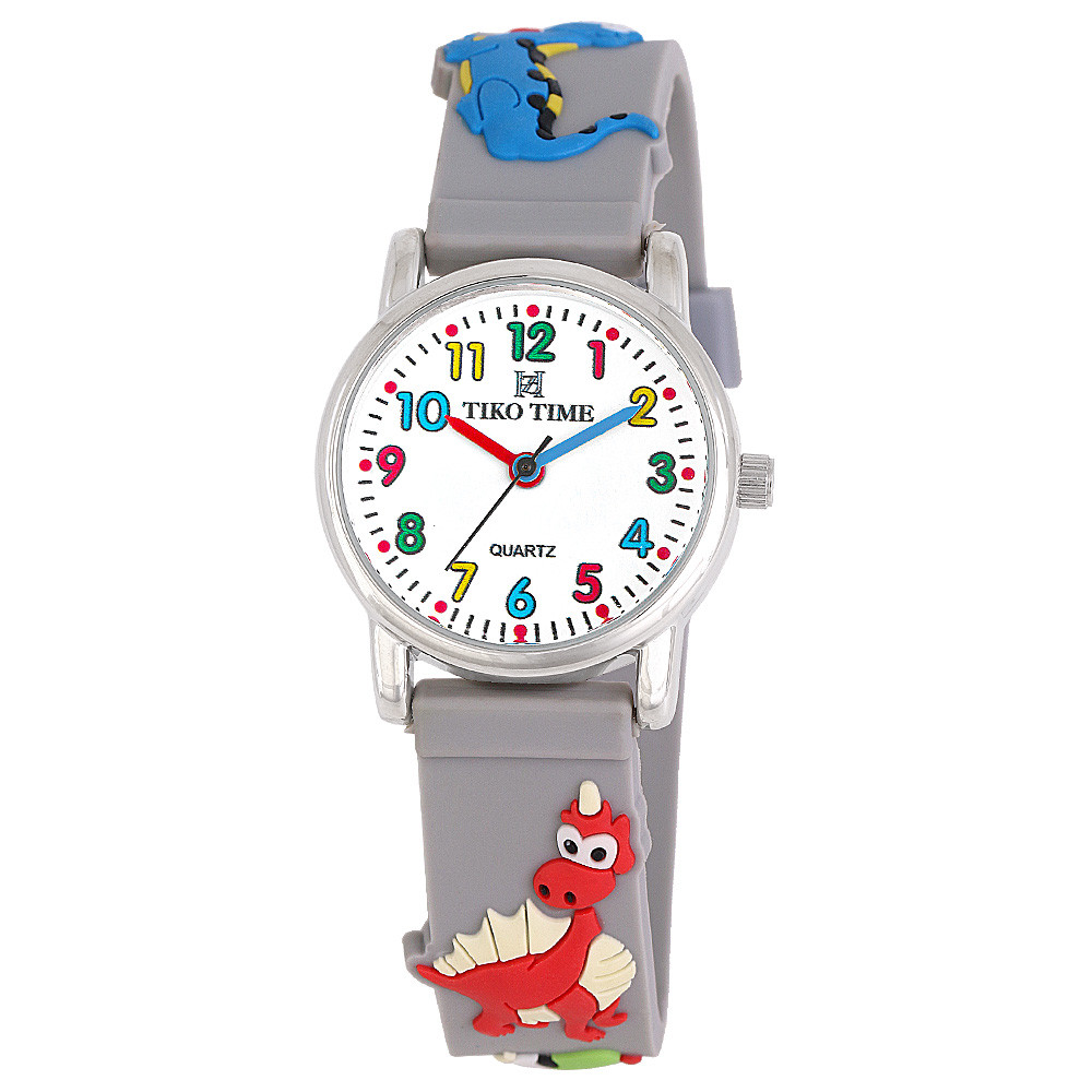Tiko Time karóra gyerekeknek, ezüst színű fémtok, quartz szerkezet, fehér arab színű számlap, 3D figurás szürke színű műanyag szíj, cseppmentes vízállóság (dínós)