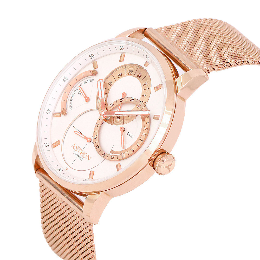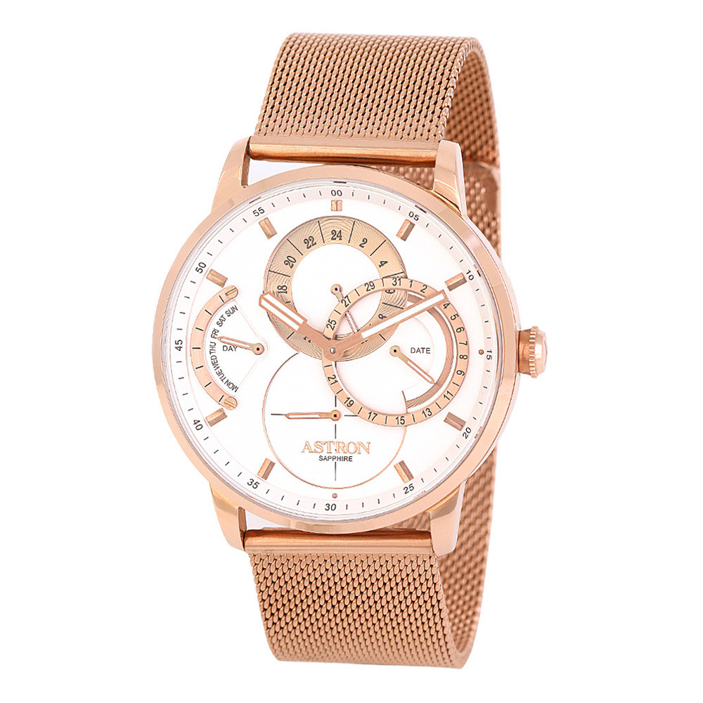 ASTRON 8026-5 férfi karóra, rózsaarany színű nemesacél tok, rózsaarany színű milánó nemesacéli csat, fehér számlap, zafírüveg, quartz szerkezet, cseppmentes vízállóság