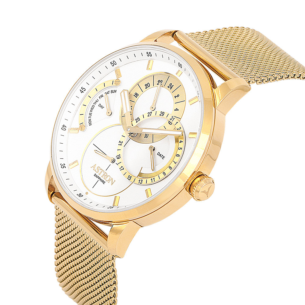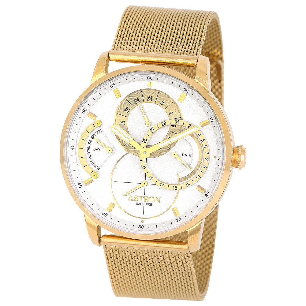 ASTRON 8026-6 férfi karóra, arany színű nemesacél tok, arany színű milánói nemesacél csat, fehér számlap, zafírüveg, quartz szerkezet, cseppmentes vízállóság