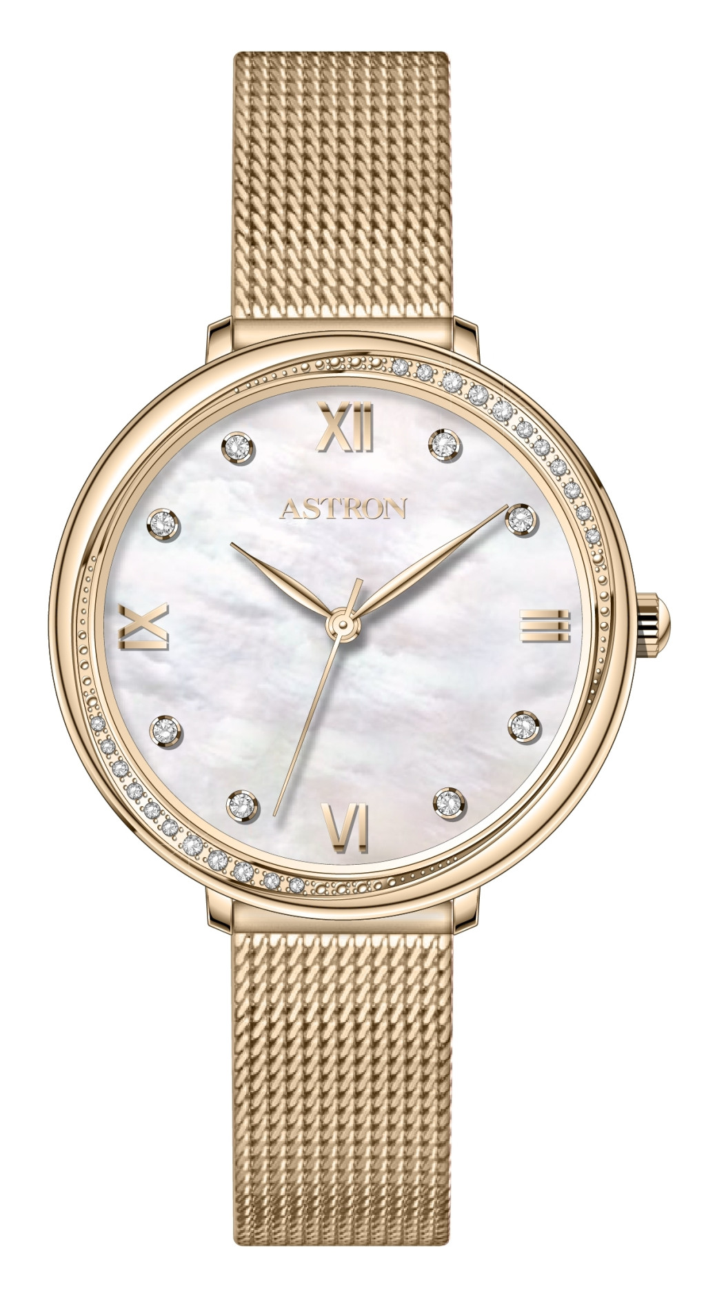 ASTRON 8065-9 női karóra, arany színű nemesacél tok, arany színű milánói csat, fehér számlap, keményített ásványüveg, quartz szerkezet, WR 50M vízállóság
