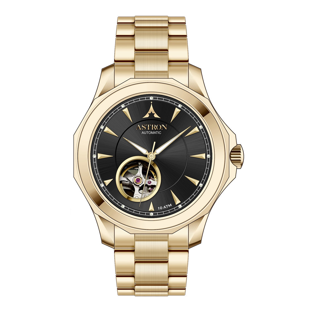 ASTRON 8066-0 automata férfi karóra, arany színű nemesacél tok, arany színű nemesacél csat, fekete számlap, zafír üveg, mechanikus automata szerkezet, WR100M vízállóság