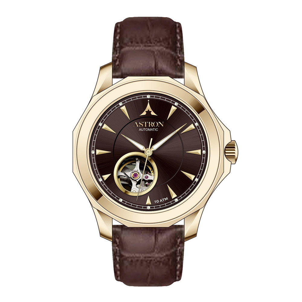 ASTRON 8066-6 automata férfi karóra, arany színű nemesacél tok, sötét barna valódi bőrszíj, sötét barna számlap, zafír üveg, mechanikus automata szerkezet, WR100M vízállóság